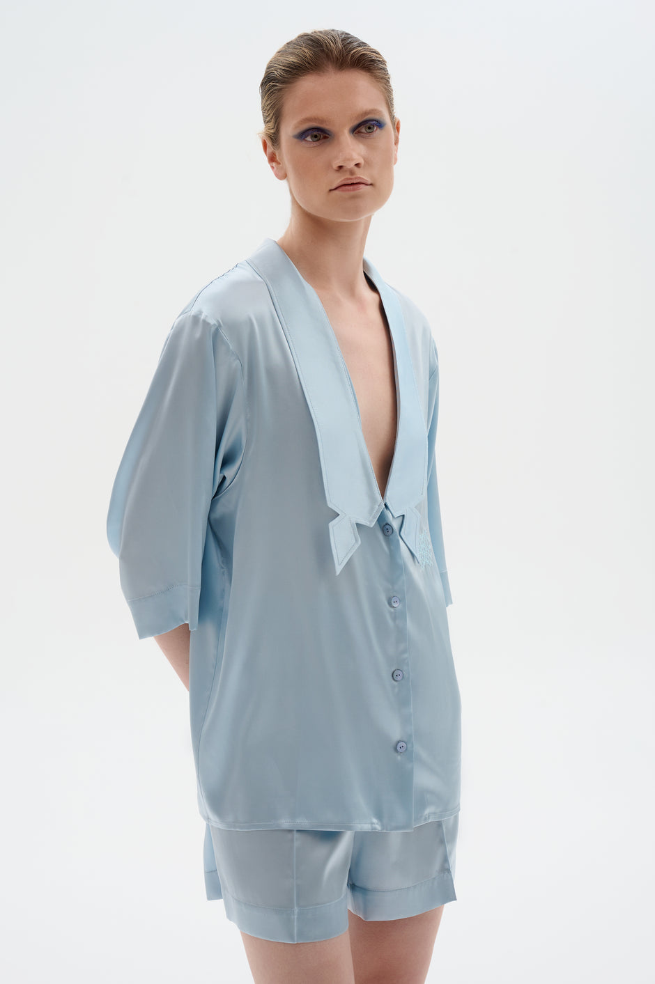 Silk shorts with "energy" embroideryAvailable for pre-order.