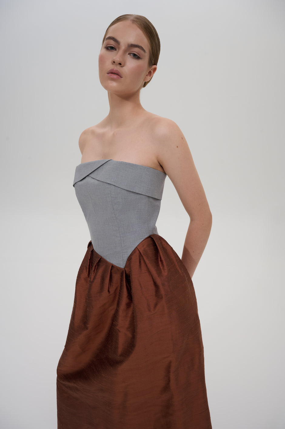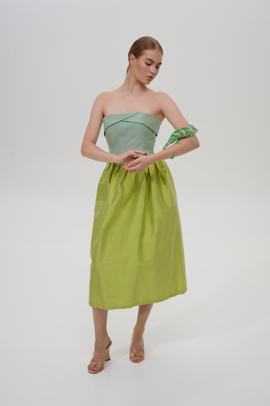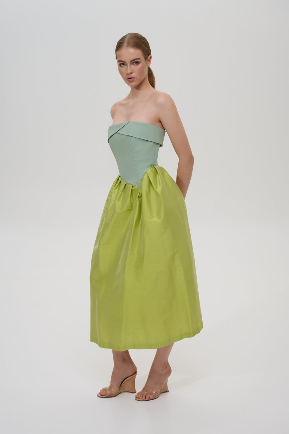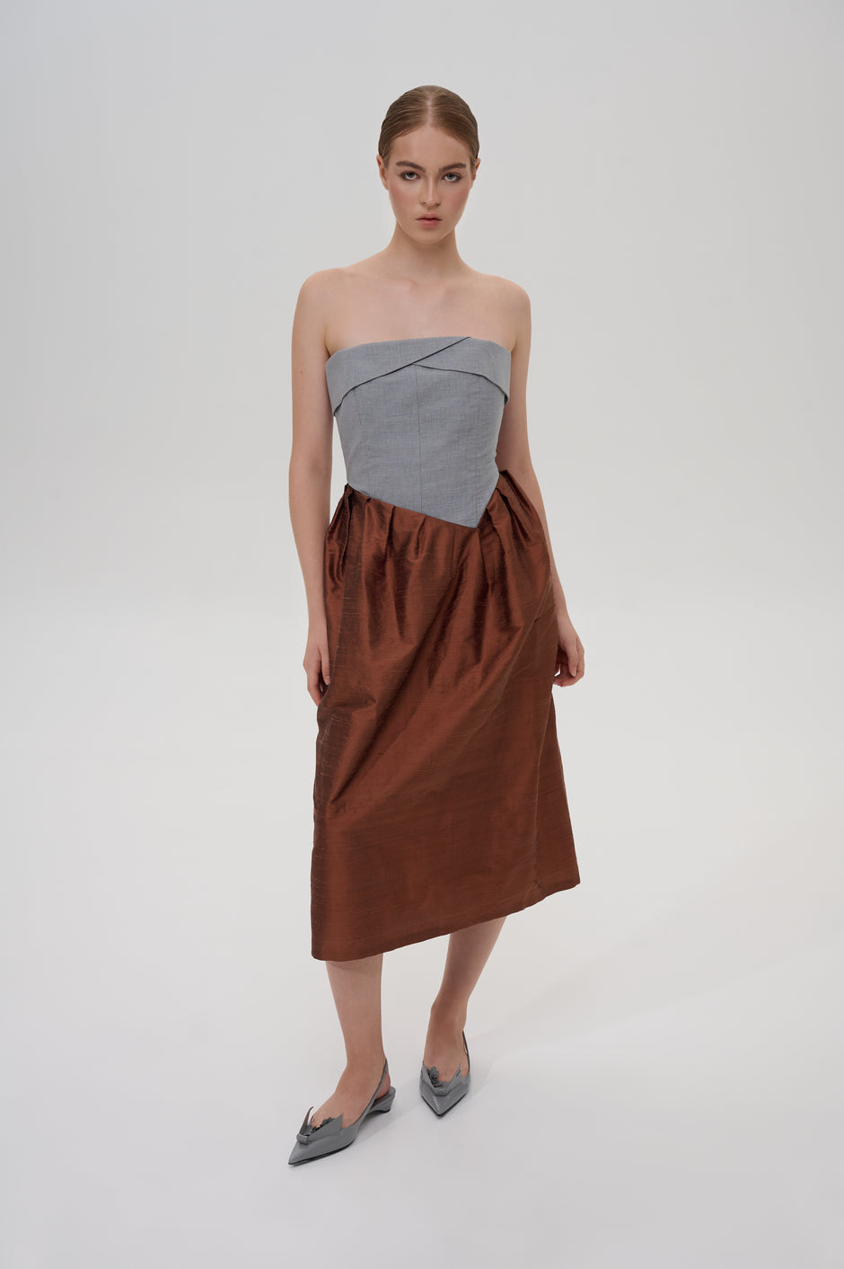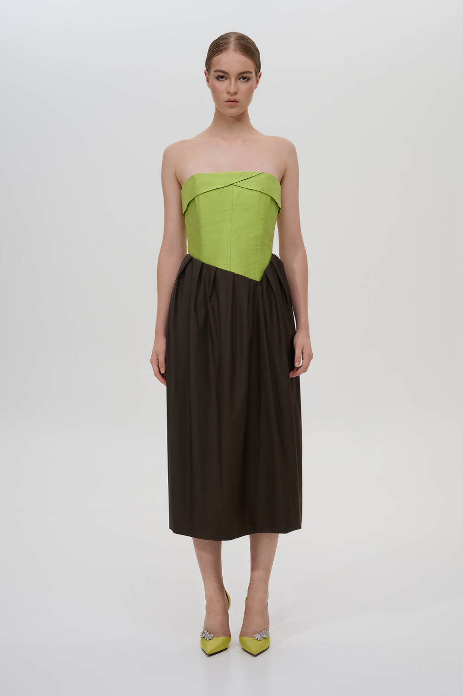 Pleated strapless midi dress